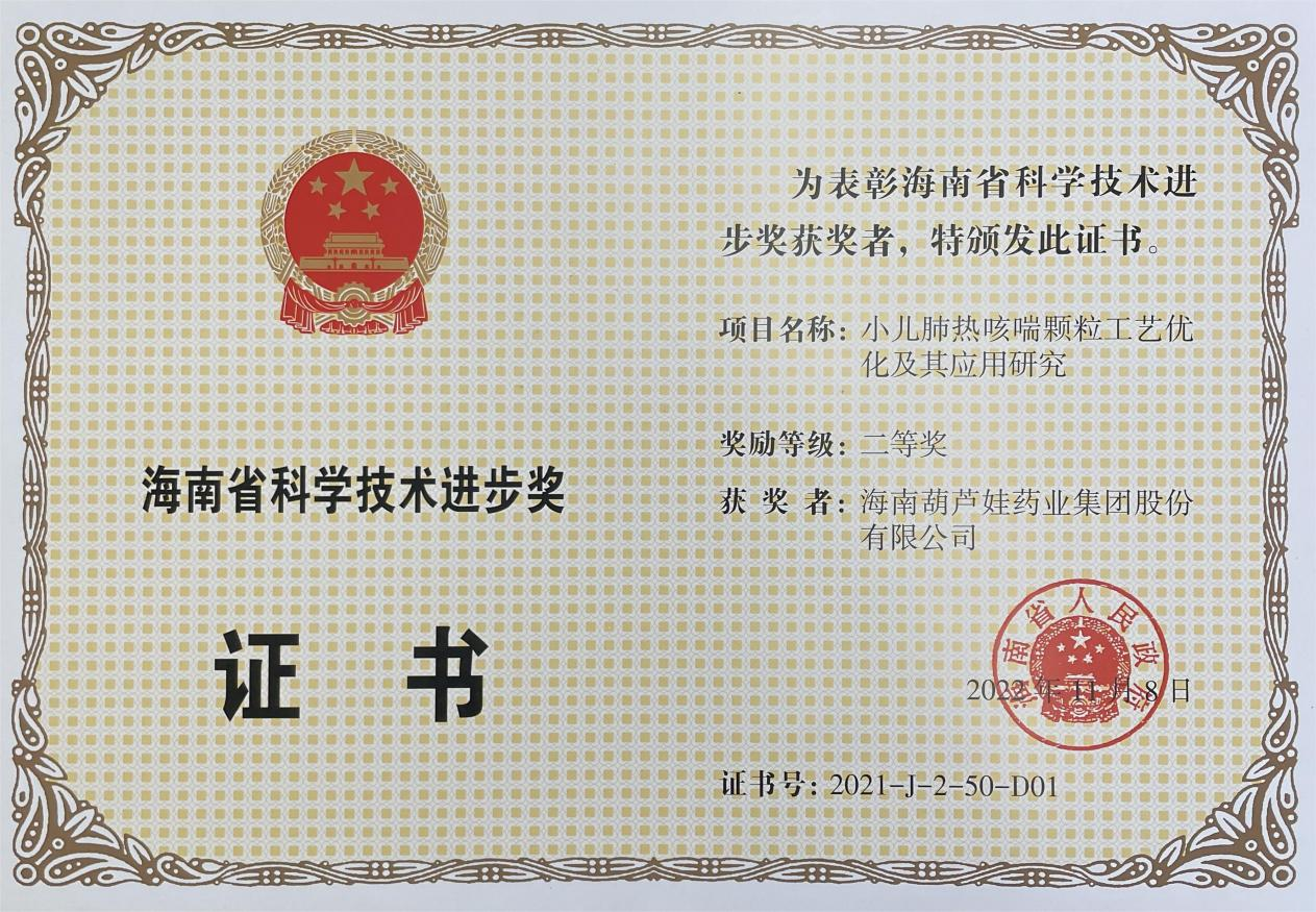 为此,小儿肺热咳喘颗粒的制备方法获得了第二十一届中国专利优秀奖(2019年),专利申请号:ZL201010134951,此次作为专利技术的应用,获得了2021年度海南省科学技术进步奖二等奖。在此之前,尊龙时凯牌小儿肺热咳喘颗粒还多次被授予“临床价值中成药品牌”、“中国连锁药店最具合作价值单品”,荣登“中国医药品牌榜”。